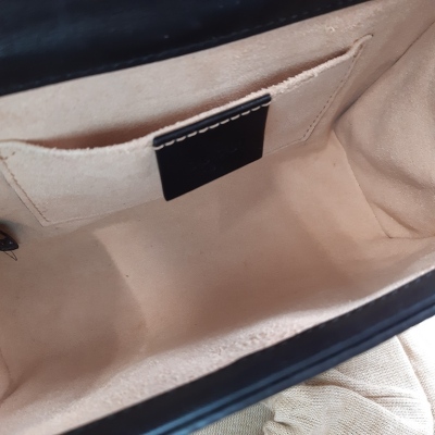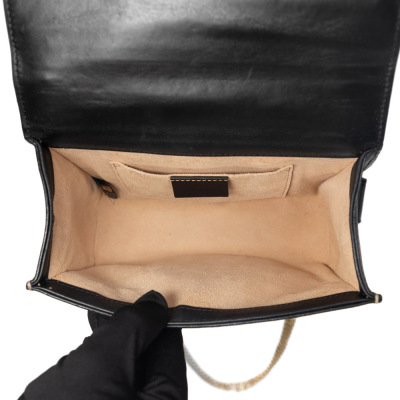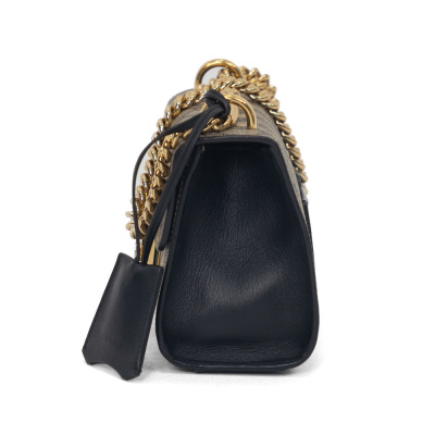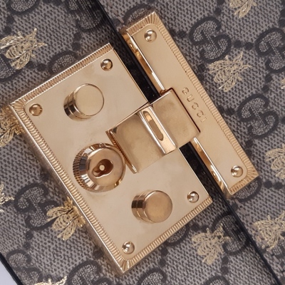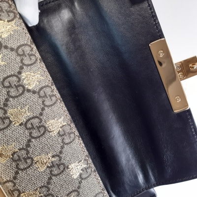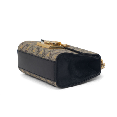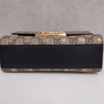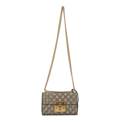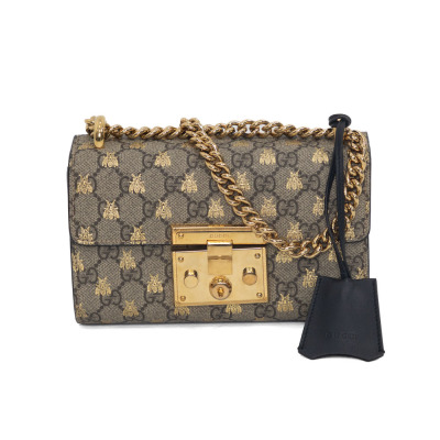 Gucci small Padlock chain bag in GG supreme canvas and black leather. Featuring gold bees printed on canvas, gold-tone hardware, a rear flat pocket in black leather. Frontal flap with padlock closure opens to a beige suede-like lining interior with a patch pocket. Approximate dimensions: 20cm(L) x 13cm(H) x 7.5cm(D), 50cm single chain drop. Accompanied by keys in the leather crochet. With LegitApp certificate of authenticity. (Pre-owned)