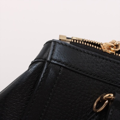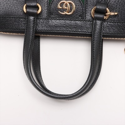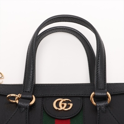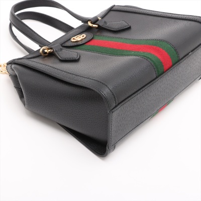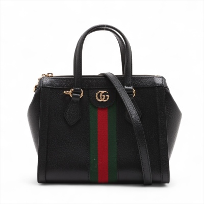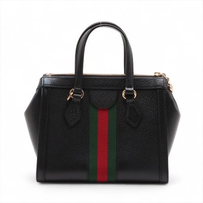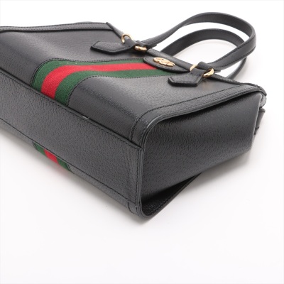 Gucci small Ophidia Web tote bag in black textured calfskin. Featuring gold-toned hardware, dual top handles, interlocking GG logo at front, and green & red web stripe detail. The zipper top opens to a beige microfibre interior with two patch pockets. Approximate dimensions: 24cm(L) x 19.5cm(H) x 10cm(D), handle drop 9.5cm, adjustable & detachable shoulder strap drop 66.5cm. Accompanied by a Gucci dustbag. With Entrupy Certificate of Authenticity. (Pre-owned)