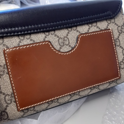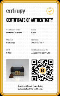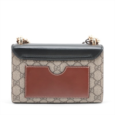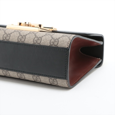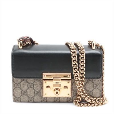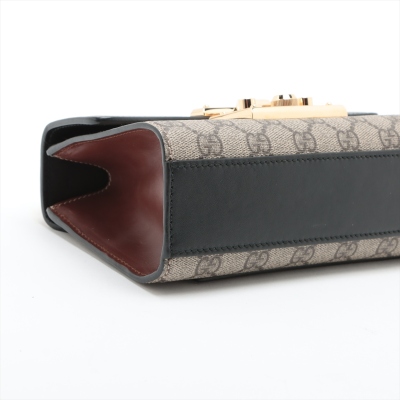 Gucci small Padlock chain bag in GG supreme canvas and leather. Featuring gold-tone hardware, a rear flat pocket in brown leather, black leather flap with push-lock closure. This opens to a brown suede-like lining interior with a patch pocket. Approximate dimensions: 20cm(L) x 13cm(H) x 7.5cm(D), 50cm single chain drop. Accompanied by keys in the leather crochet. With Entrupy Certificate of Authenticity. (Pre-owned)