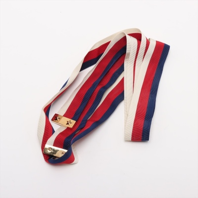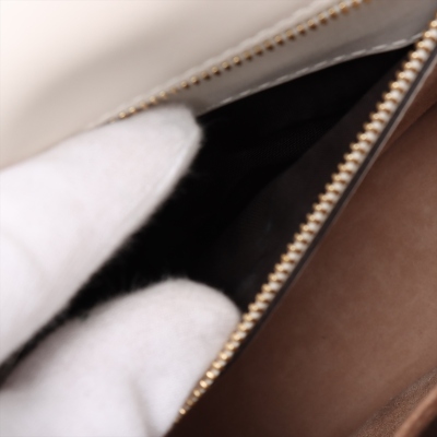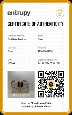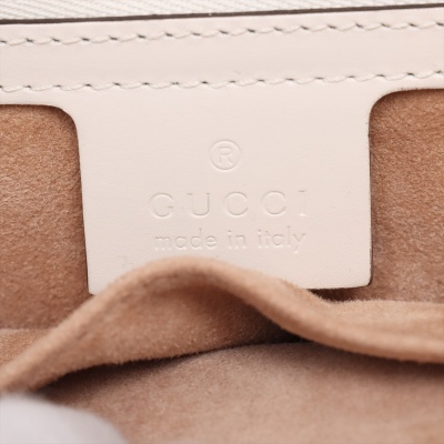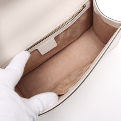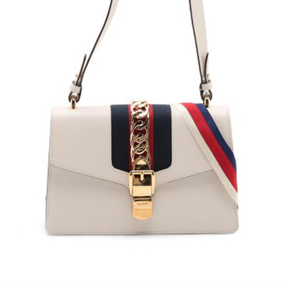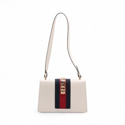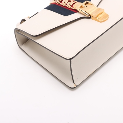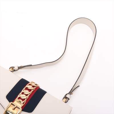 Gucci small Sylvie shoulder bag in white calfskin leather. Featuring gold-toned hardware, a chain buckle lock closure at the front detailed with a central red and navy blue web stripe, and a detachable strap. The flap opens to a beige microfibre lining interior with a zippered and patch pocket. Approximate dimensions: 26cm(Base-W) x 17cm(H) x 8cm(D), with a 33cm leather strap drop. Accompanied with a striped ribbon. With Entrupy Certificate of Authenticity.