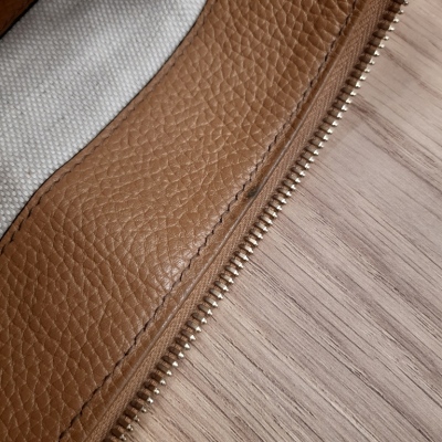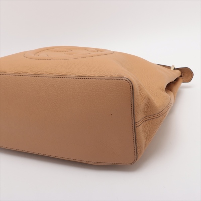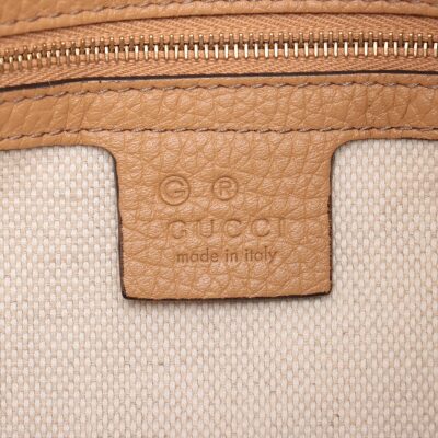 Gucci Soho 2way tote bag in beige grainy calfskin leather. Featuring light gold-tone hardware, single flat top handle, interlocking GG logo stitched at front. The top zipper closure with tassel opens to a beige fabric lining interior with zipper and patched pockets. Approx dimensions: 34cm(L) x 32cm(H) x 14cm(D), 10cm handle drop, 45cm detachable and adjustable strap drop. Accompanied by Gucci dustbag. With Entrupy Certificate of Authenticity. (Pre-owned)