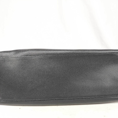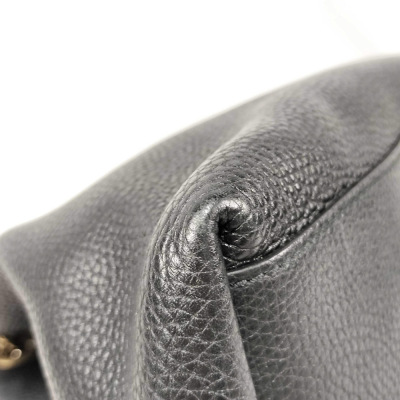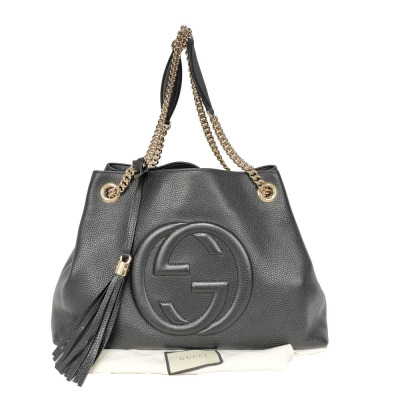 Gucci Soho medium shoulder bag in black grained calfskin leather. Featuring light gold-toned hardware, embossed interlocking GG logo at front, and detachable leather tassel at front. The hook closure opens to a beige textile interior with a zipper and patch pockets. Approximate dimensions: 37cm(Base-L) x 27cm(H) x 15cm(D), double chain shoulder strap drop 22cm. Accompanied by a Gucci dustbag. With Entrupy Certificate of Authenticity. (Pre-owned)
