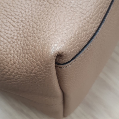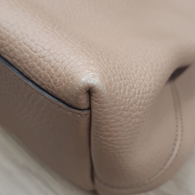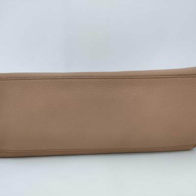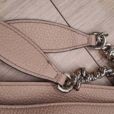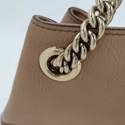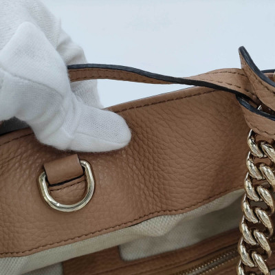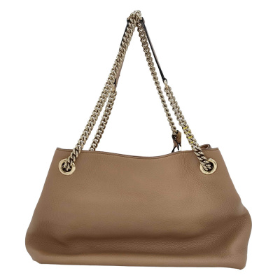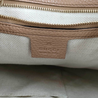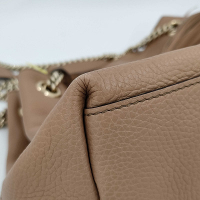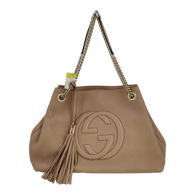 Gucci Soho medium shoulder bag in beige calfskin leather. Featuring light gold-toned hardware, embossed interlocking GG logo, and detachable leather tassel at front. The hook closure opens to a cream textile interior with a zipper and patch pockets. Approximate dimensions: 37cm(Base-L) x 26cm(H) x 14cm(D), double chain shoulder strap drop 21cm. With Entrupy Certificate of Authenticity. (Pre-owned)