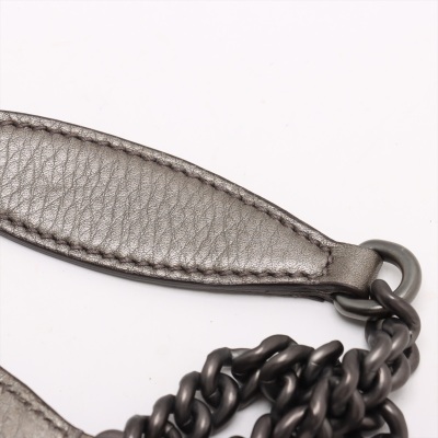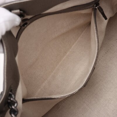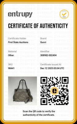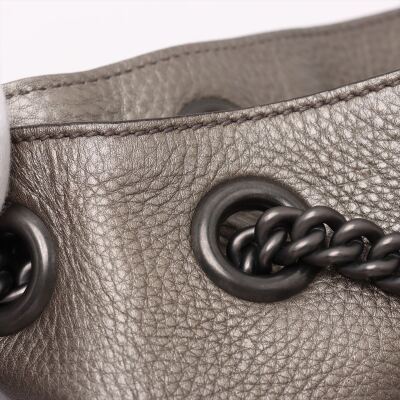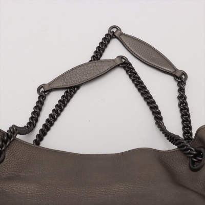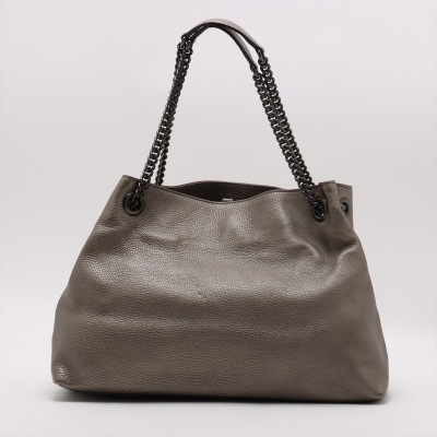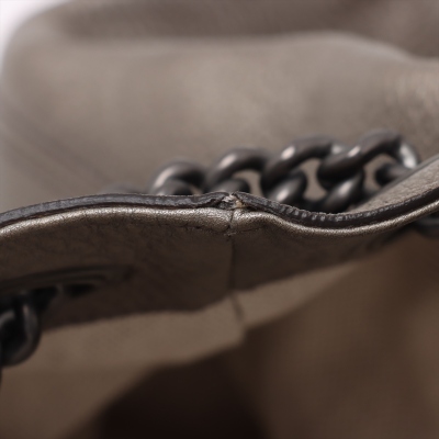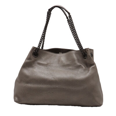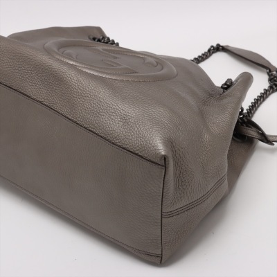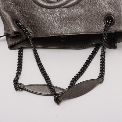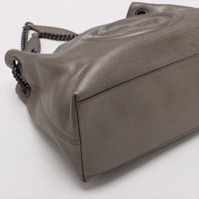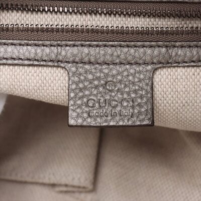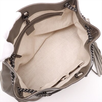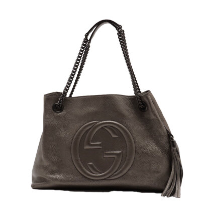 Gucci Soho medium shoulder bag in metallic khaki calfskin leather. Featuring metal-toned hardware, embossed interlocking GG logo, and detachable leather tassel at front. The hook closure opens to a cream textile interior with a zipper and patch pockets. Approximate dimensions: 37cm(Base-L) x 26cm(H) x 14cm(D), double chain shoulder strap drop 18.5cm. Accompanied by a Gucci dustbag. With Entrupy Certificate of Authenticity. (Pre-owned).