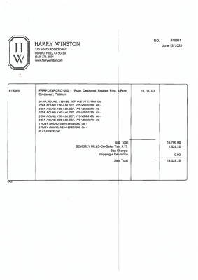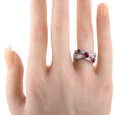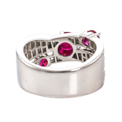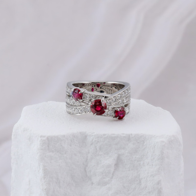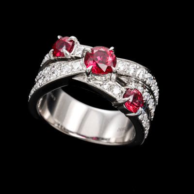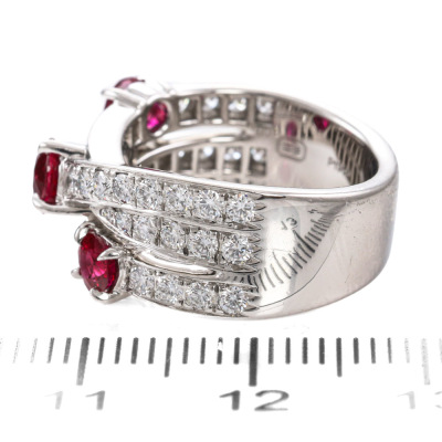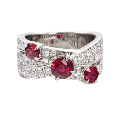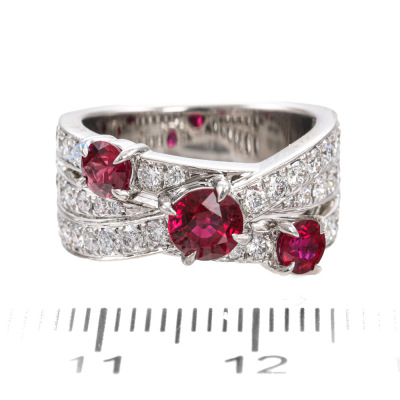 Harry Winston crossover ring with three round Natural Rubies totalling 1.17ct and round Natural Diamonds totalling 0.82ct (Harry Winston graded as DEF VVS-VS). Platinum-950. Ring size I1/2 - ring resizing is not recommended. Band width: 6.5mm - 8.0mm. Weight: 14.2g. With Copy of Harry Winston Receipt and Harry Winston Box. (Pre-owned)