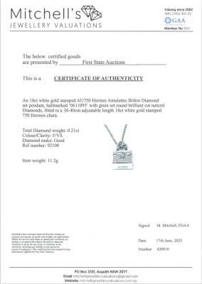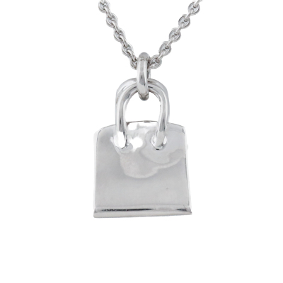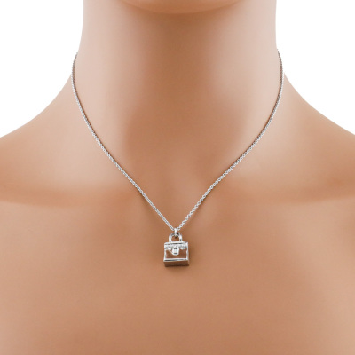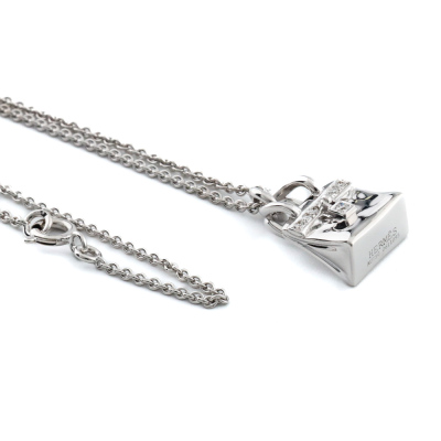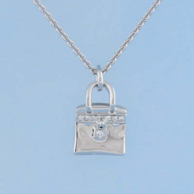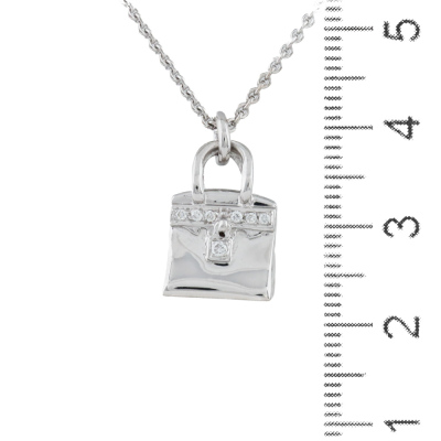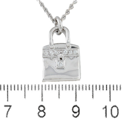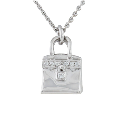Hermes Amulettes Birkin pendant with round Natural Diamonds totalling 0.21ct. Motif size: 16 x 11 mm. 18ct white gold with Hermes 38cm - 40cm 18ct white gold adjustable chain. Made in France. Weight: 11.2g. With Hermes Box. With Certificate #420810. (Pre-owned)