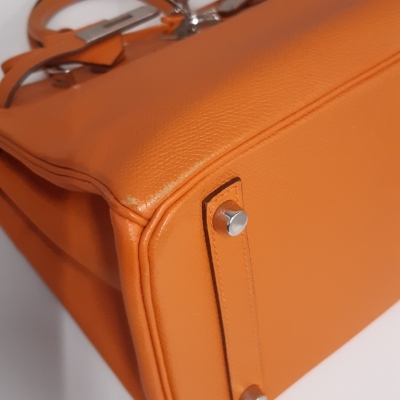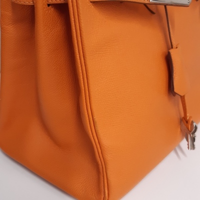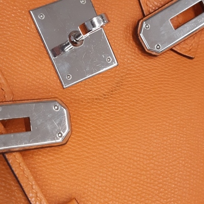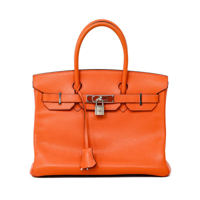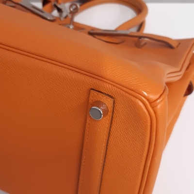 Hermes Birkin 30 in Orange Epsom leather (square J: 2006). Featuring silver-toned hardware, rolled leather handles, frontal flaps with closure straps and turn-lock mechanism. The top flap opens to a colour matching leather interior with a patch and zip pocket. Approximate dimensions: 30cm(L) x 22cm(H) x 6cm(D), handle drop 10cm. Accompanied by Hermes keys in leather clochette and padlock, and dustbag. With Entrupy Certificate of Authenticity. (Pre-owned)