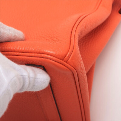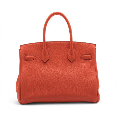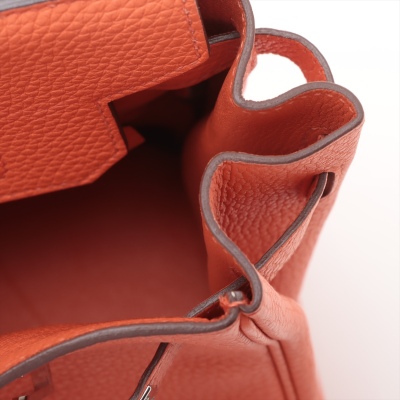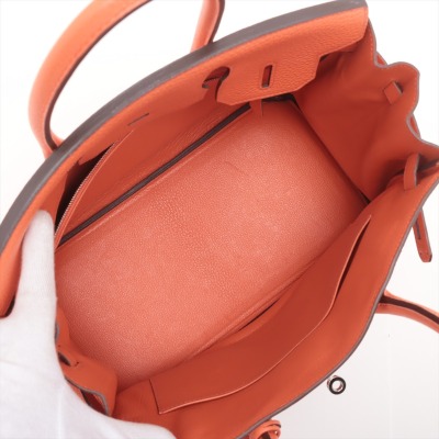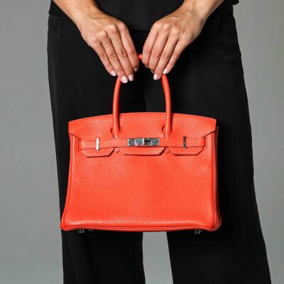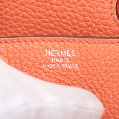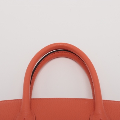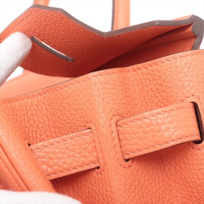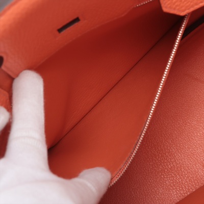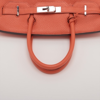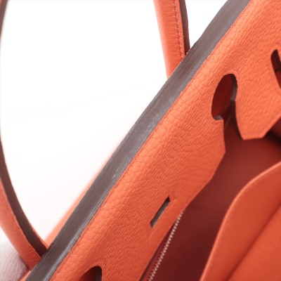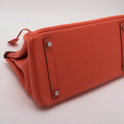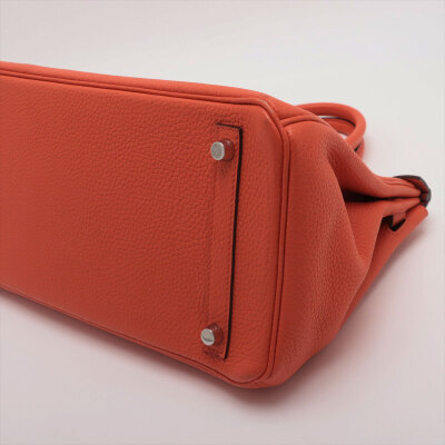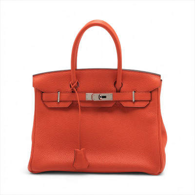 Hermes Birkin 30 in Poppy Orange Taurillon Clemence leather (X: 2016). Featuring silver-toned hardware, rolled leather top handles, frontal flap with closure straps and turn-lock mechanism. The top flap opens to colour matching leather interior with patch and zipper pocket. Approx dimensions: 30cm(L) x 22cm(H) x 16cm(D), handle drop 10cm. Accompanied by Hermes keys in leather clochette, padlock, dustbag, and box. With Entrupy Certificate of Authenticity. (Pre-owned)