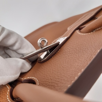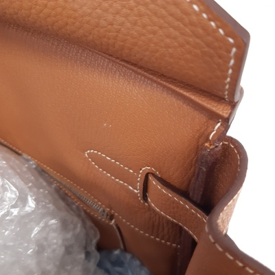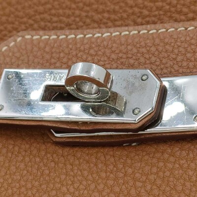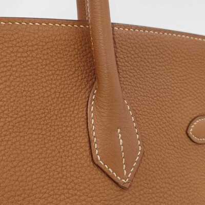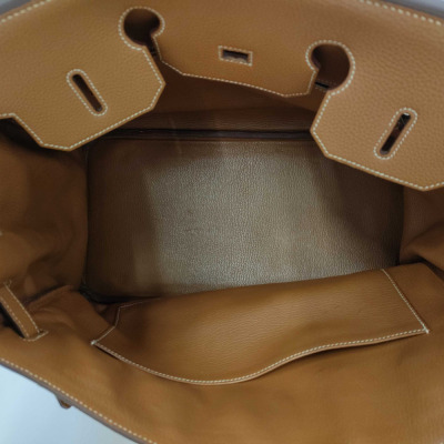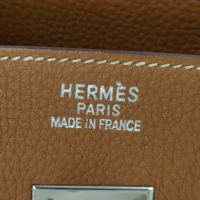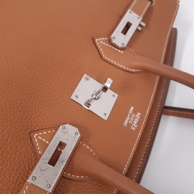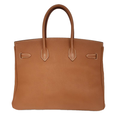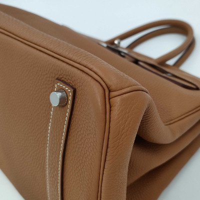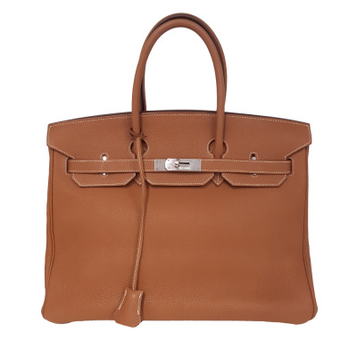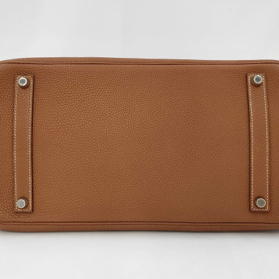 Hermes Birkin 35 in gold Togo leather (Square I: 2005). Featuring silver-toned hardware, rolled leather top handles, frontal flap with closure straps and turn-lock mechanism. The top flap opens to a colour matching leather interior with patch and zip pockets. Approximate dimensions: 35cm(L) x 27cm(H) x 19cm(D), handle drop 10cm. Accompanied by keys in leather clochette. Note: Padlock NOT included. With Entrupy Certificate of Authenticity. (Pre-owned)