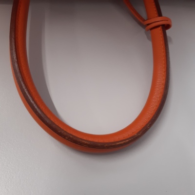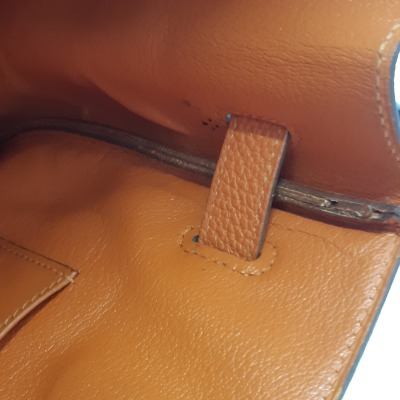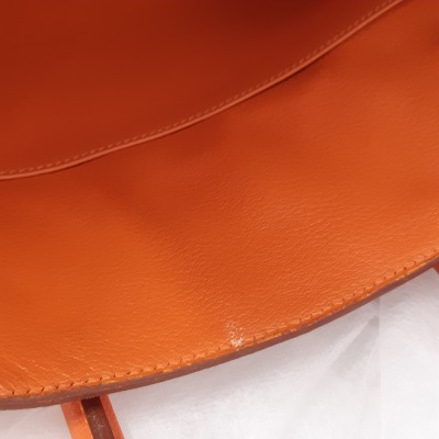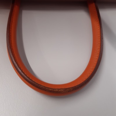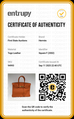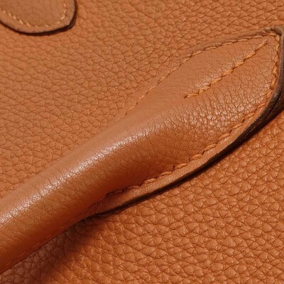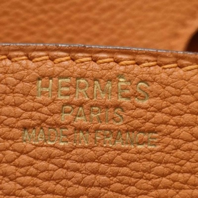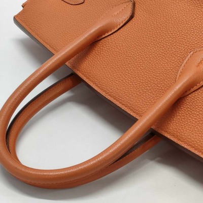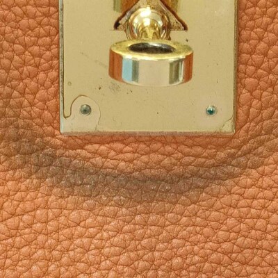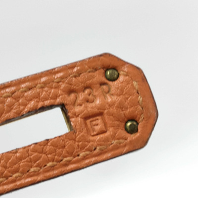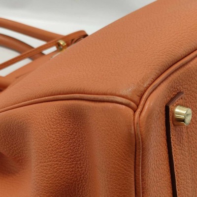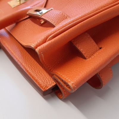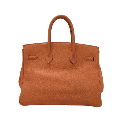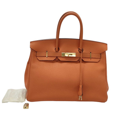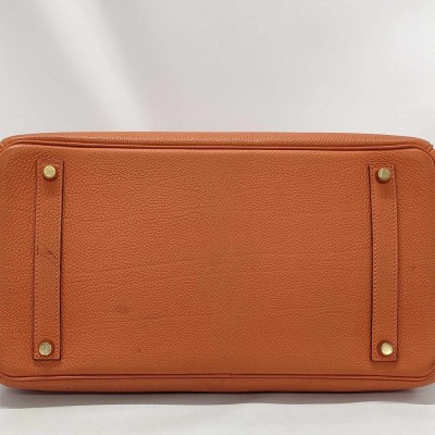 Hermes Birkin 35 in orange Togo leather (Square F: 2002). Featuring gold-toned hardware, rolled leather top handles, frontal flap with closure straps and turn-lock mechanism. The front flap opens to a colour matching leather interior with patch and zipper pocket. Approximate dimensions: 35cm(L) x 27cm(H) x 19cm(D), handle drop 10cm. Accompanied by Hermes keys in leather clochette and padlock. With Entrupy Certificate of Authenticity. (Pre-owned)