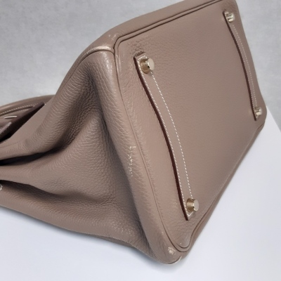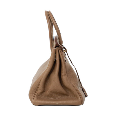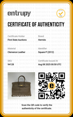 Hermes Birkin 35 in Etoupe Taurillon Clemence leather (Square P, 2012). Featuring gold-toned hardware, rolled leather top handles, frontal flap with closure straps and turn-lock mechanism. The top flap opens to a colour matching leather interior with patch and zip pockets. Approx. dimensions: 35cm(L) x 27cm(H) x 19cm(D), handle drop 10cm. Accompanied by keys in leather clochette. NOT accompanied by padlock. With Entrupy Certificate of Authenticity. (Pre-owned)