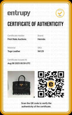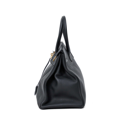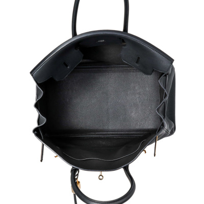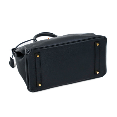 Hermes Birkin 35 in black Togo leather (Y: 2020). Featuring gold-toned hardware, rolled leather top handles, frontal flap with closure straps and turn-lock mechanism. The top flap opens to a colour matching leather interior with patch and zip pockets. Approximate dimensions: 35cm(L) x 27cm(H) x 19cm(D), handle drop 10cm. Accompanied by keys in leather clochette, padlock, and Hermes dustbag. With Entrupy Certificate of Authenticity. (Pre-owned)