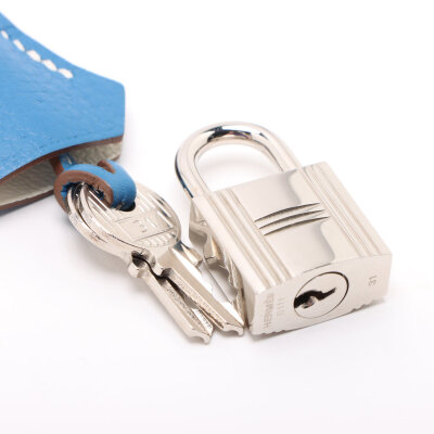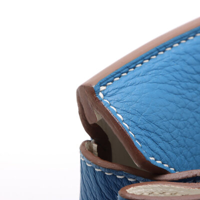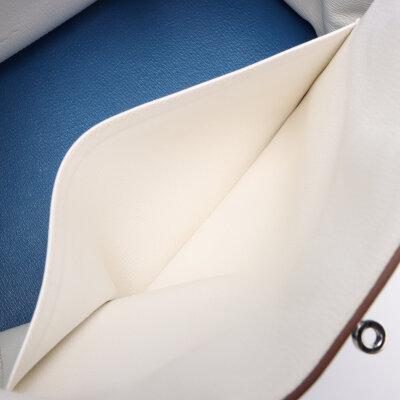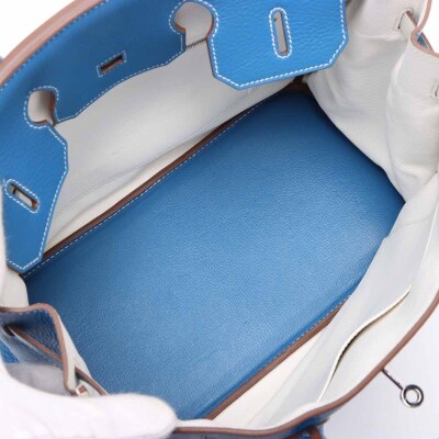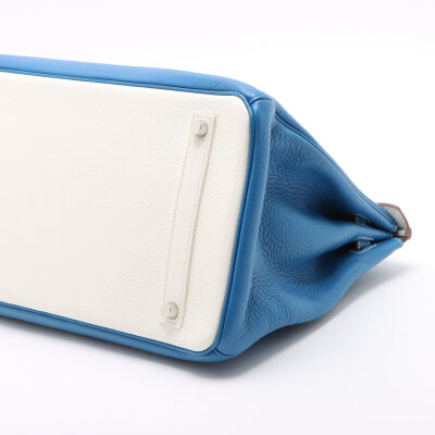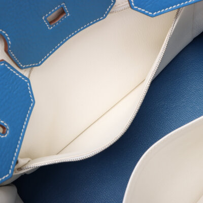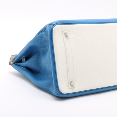 Hermes Birkin 35 in Eclat Mykonos and white Taurillon Clemence leather (square O: 2011). Featuring silver-toned hardware, rolled leather top handles, frontal flap with straps and turn lock closure. The top flap opens to a white leather interior with zipper and patch pockets. Approximate dimensions: 35cm (L) x 26cm (H) x 18cm (D) and a 9cm handle height. Accompanied by an Hermes clochette, keys with padlock and dustbag. With Entrupy Certificate of Authenticity.