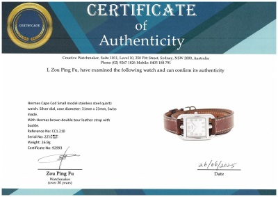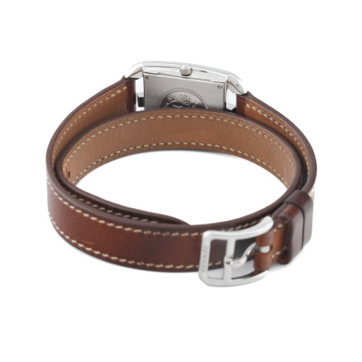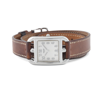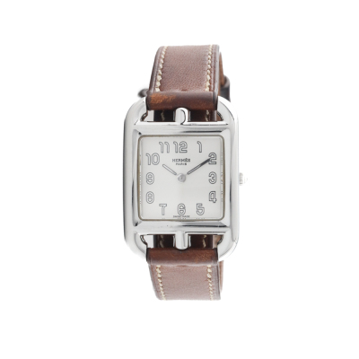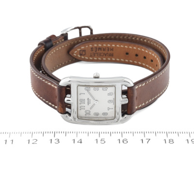 Hermes Cape Cod Small model stainless steel quartz ladies watch. Silver dial, case diameter: 31mm x 23mm, strap length: 34.5cm, Swiss made. Ref# CC1.210. With Hermes brown double tour leather strap with buckle. With Certificate of Authenticity. No warranty applies. (Pre-owned)