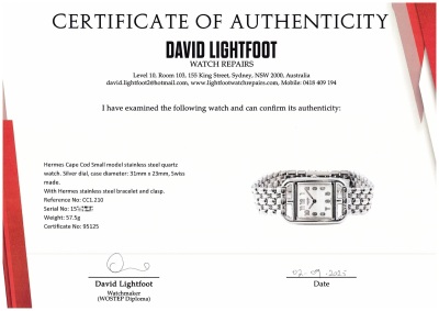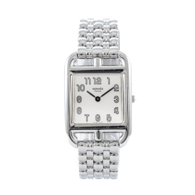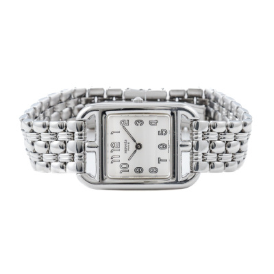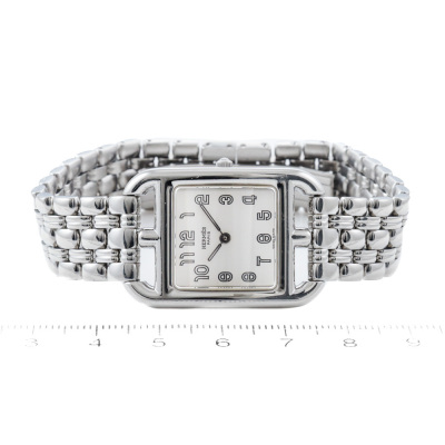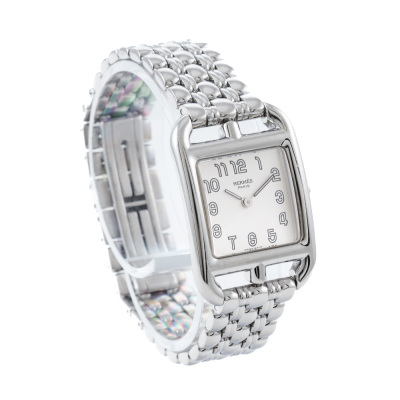 Hermes Cape Cod Small model stainless steel quartz ladies watch. Silver dial, case diameter: 31mm x 23mm, wrist size: 16cm, Swiss made. Ref# CC1.210. With Hermes stainless steel bracelet and clasp. With Certificate of Authenticity. No warranty applies. Weight: 57.5g (Pre-owned)