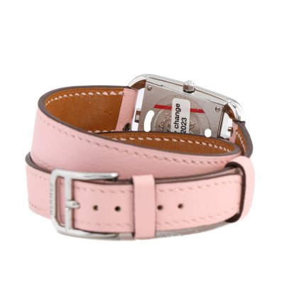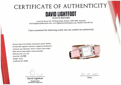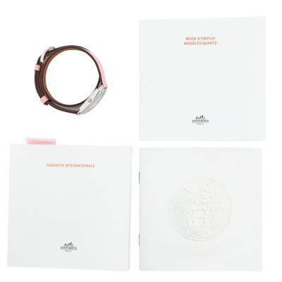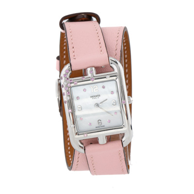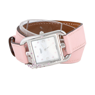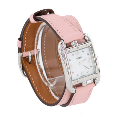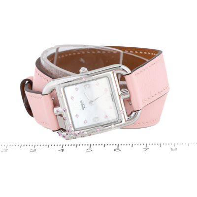 Hermes Cape Cod stainless steel quartz ladies watch. Mother of Pearl dial, Sapphire indicators, Sapphires & Diamond set bezel, case diameter: 31mm x 23mm, max wrist size: 16cm, Swiss made. Ref# CC1.233. With Hermes pink double tour leather strap and buckle. With Certificate of Authenticity, Hermes International Guarantee Booklet dated 14/03/2021 and Hermes box. 3 month FSA warranty. (Pre-owned)