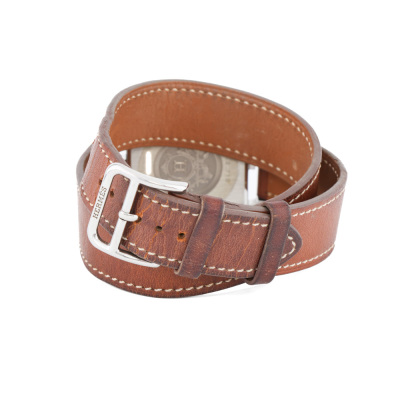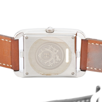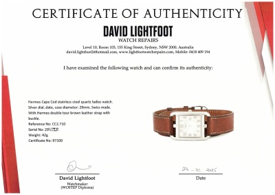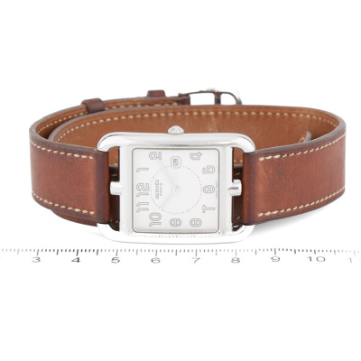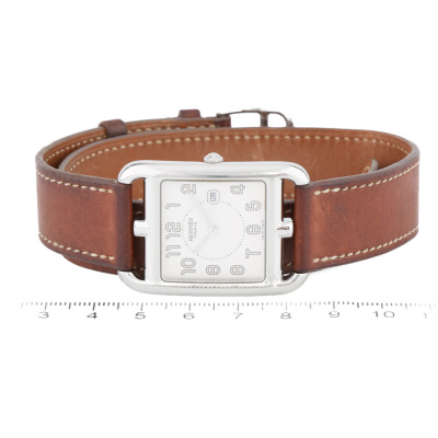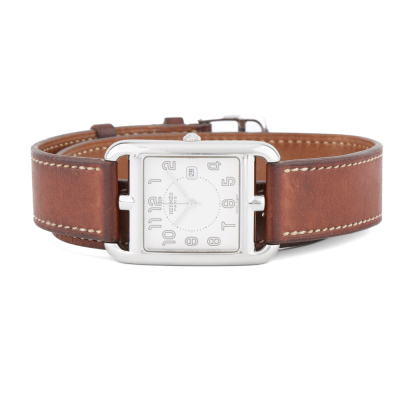 Hermes Cape Cod stainless steel quartz ladies watch. Silver dial, date, case diameter: 29mm, max wrist size: 17cm, Swiss made. Ref# CC2.710. With Hermes double tour brown leather strap with buckle. With Certificate of Authenticity, Hermes International Guarantee Booklet dated 13/11/2014 and Hermes box. 3 month FSA warranty. Weight: 42g. (Pre-owned)