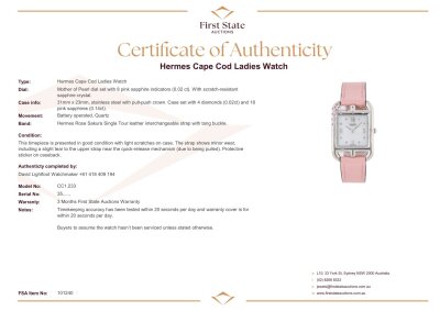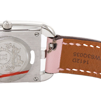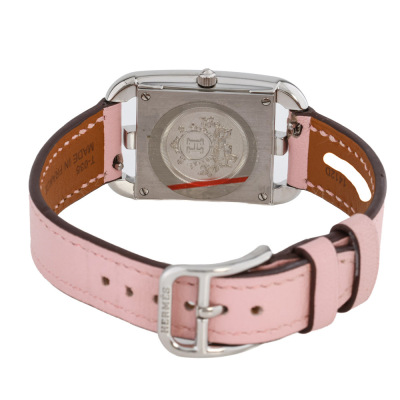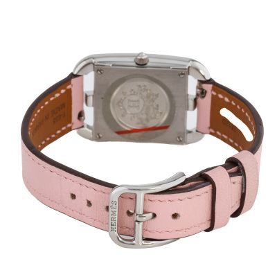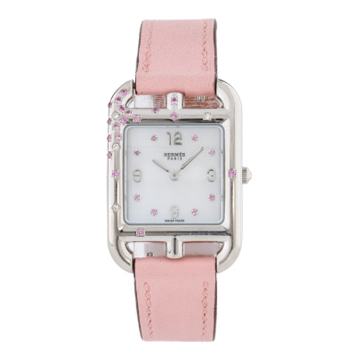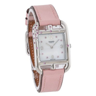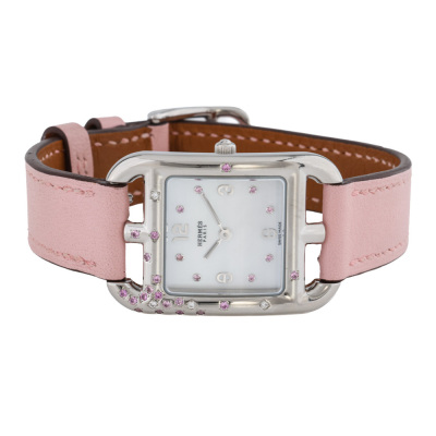 Hermes Cape Cod stainless steel quartz ladies watch. Mother of Pearl dial, Sapphire indicators, Sapphires & Diamond set bezel, case diameter: 31mm x 23mm, max wrist size: 16.5cm, Swiss made. Ref# CC1.233. With Hermes pink leather strap and buckle. With Certificate of Authenticity. 3 month FSA warranty. Weight: 22.9g.