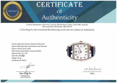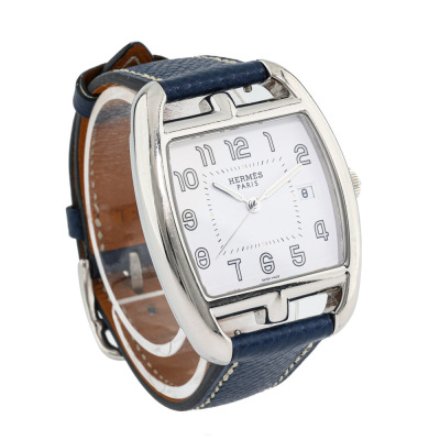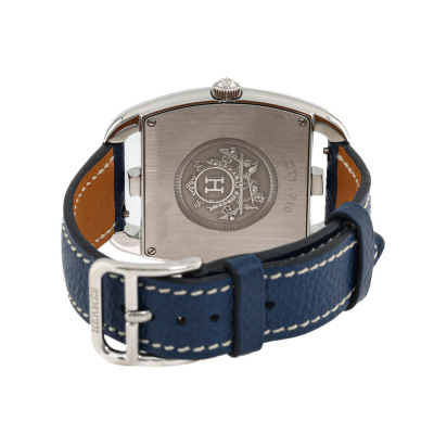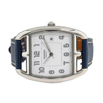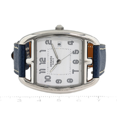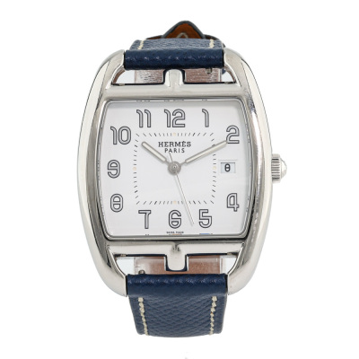 Hermes Cape Cod Tonneau stainless steel quartz watch. White dial, date, approximate case diameter: 42mm x 33mm, strap length: 17.5cm, Swiss made. Ref# CT1.710. With Hermes blue leather strap and buckle. With Certificate of Authenticity and Hermes pouch. No warranty applies. (Pre-owned)