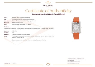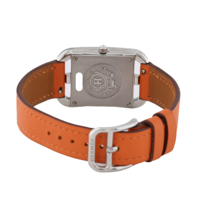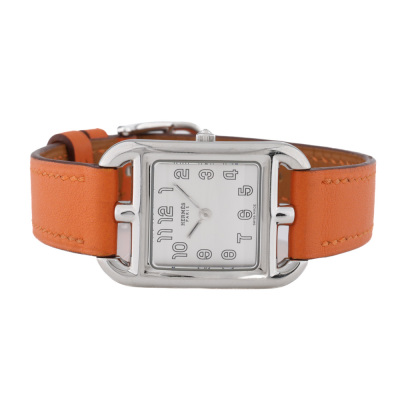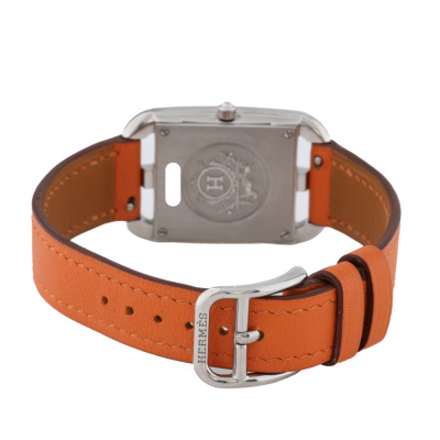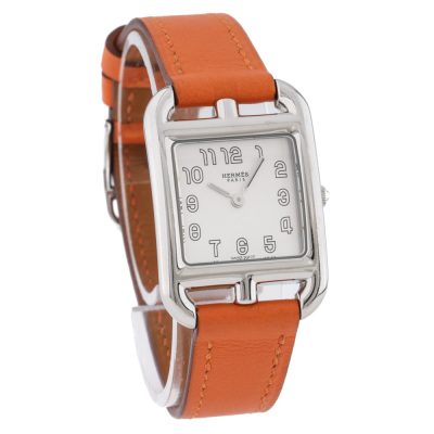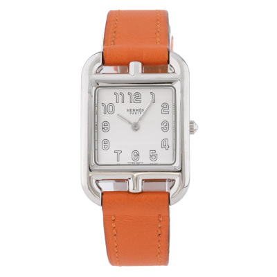 Hermes Cape Cod small model stainless steel quartz ladies watch. Silver dial, case diameter: 33mm x 23mm, wrist size: 16.5cm, Swiss made. Ref# CC1.210A. With Hermes orange leather strap and buckle. With Certificate of Authenticity. With 3 months warranty of FSA