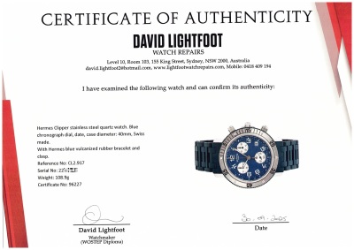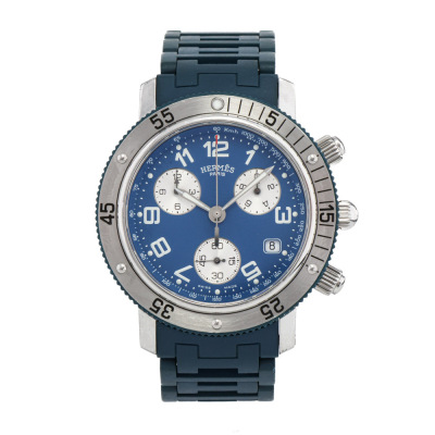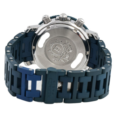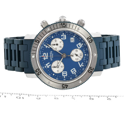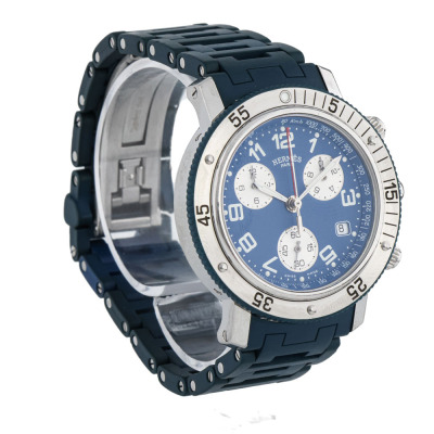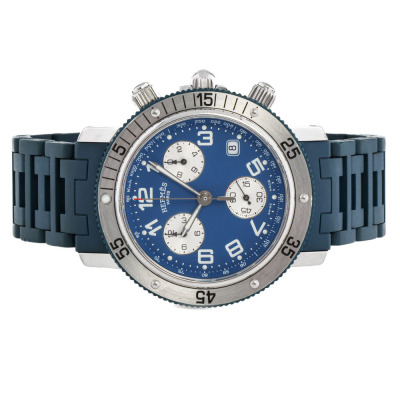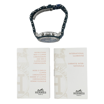 Hermes Clipper stainless steel quartz mens watch. Blue chronograph dial, date, case diameter: 40mm, wrist size: 18cm, Swiss made. Ref# CL2.917. With Hermes blue vulcanized rubber bracelet and clasp. With Certificate of Authenticity and Hermes International Guarantee Booklet dated 02/02/2008. No warranty applies. Weight: 108.9g (Pre-owned)