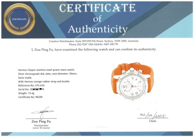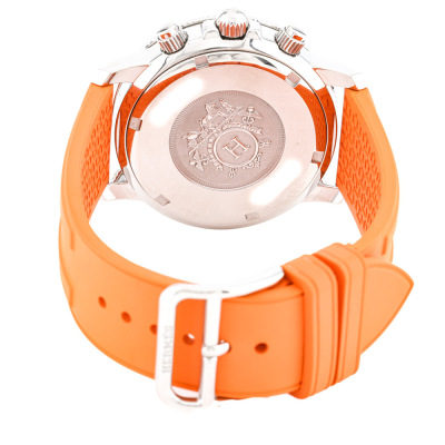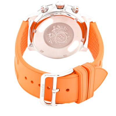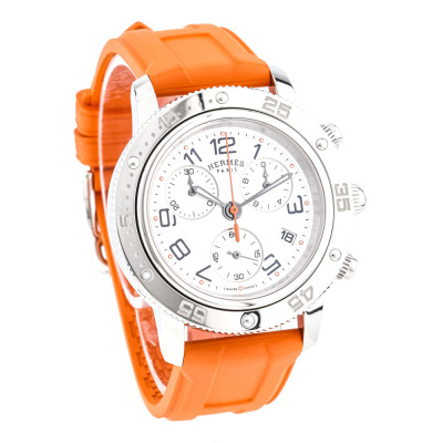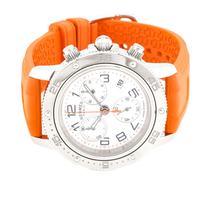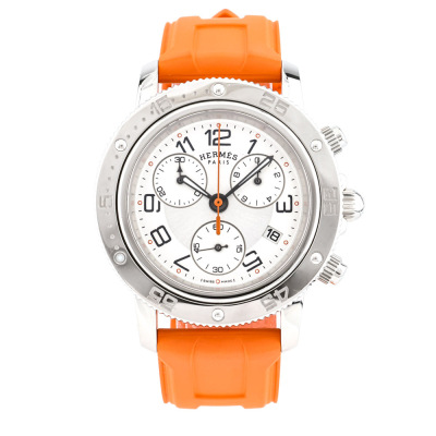 Hermes Clipper stainless steel quartz mens watch. Silver chronograph dial, date, case diameter: 36mm, max wrist size: 17cm, Swiss made. Ref# CP2.410. With Hermes orange rubber strap and buckle. With Certificate of Authenticity, Hermes International Guarantee booklet dated 15/08/2012 and Hermes box. 3 month FSA warranty. Weight: 73.4g. (Pre-owned)