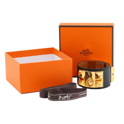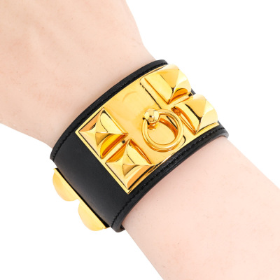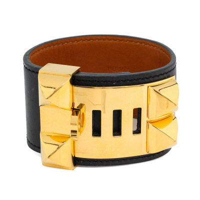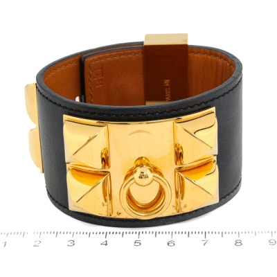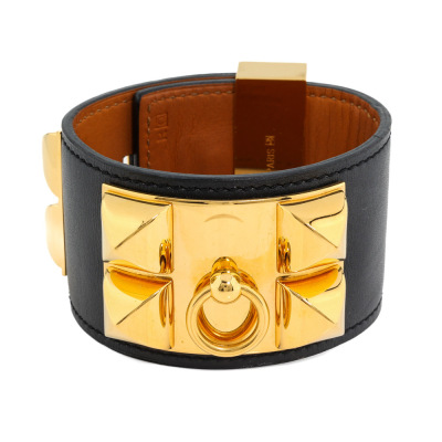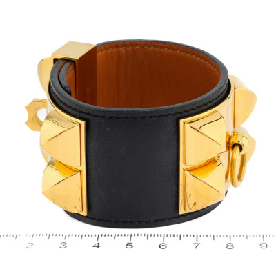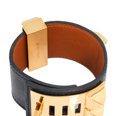 Hermes Collier de Chien Cuff. Black leather with Collier closure. Yellow gold plated steel. Wrist size from 14cm to 16.5cm. Width: 4cm. Made in France. Weight: 104.9g. With Hermes box. (Pre-owned)*