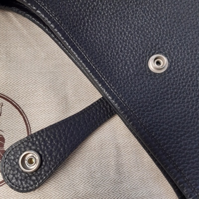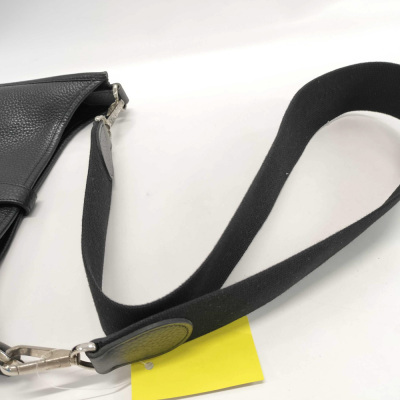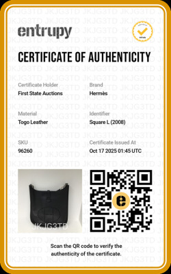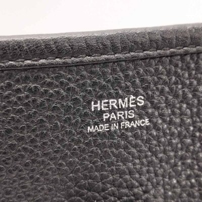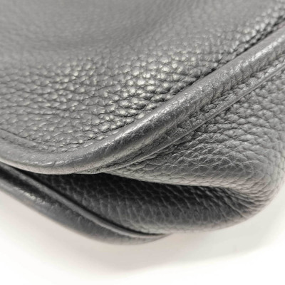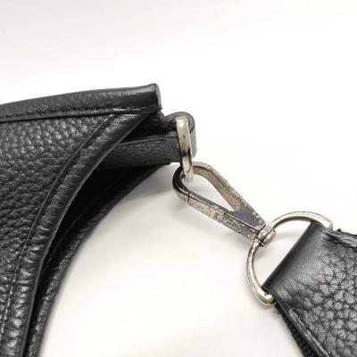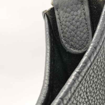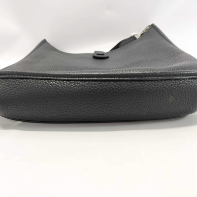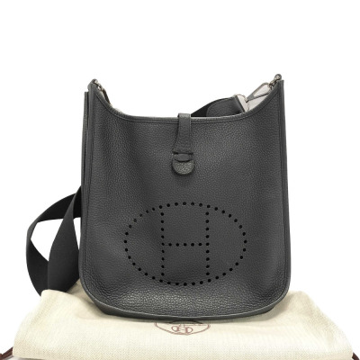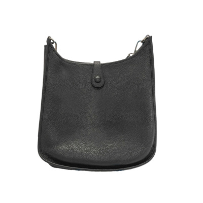 Hermes Evelyne I 29 PM in black Taurillon Clemence leather (square L: 2008). Featuring a perforated Hermes H oval at front and a canvas crossbody strap with silver-toned hardware. The snap button top on a crossover strap opens to a suede main compartment. Approximate dimensions: 30cm(L) x 30cm(H) x 7cm(D), 48m strap drop. Accompanied by Hermes dustbag. With Entrupy Certificate of Authenticity. (Pre-owned)