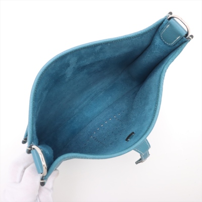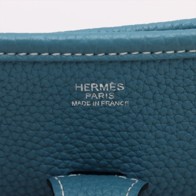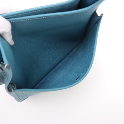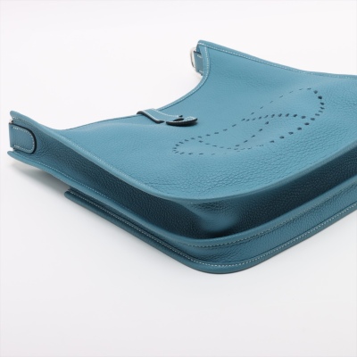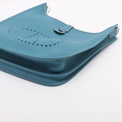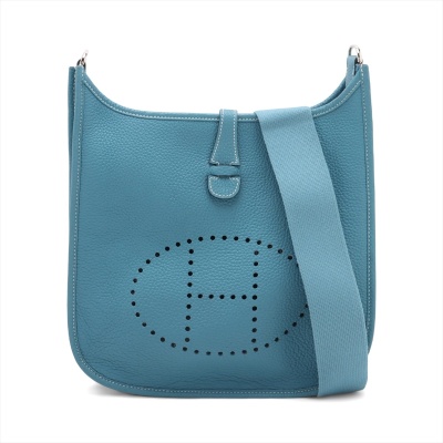 Hermes Evelyne III 29 PM in Blue Jean Taurillon Clemence leather (square P |2012). Featuring silver-toned hardware, perforated H oval at front, and adjustable canvas crossbody strap. The snap button closure opens to a suede lining interior, and an exterior patch pocket. Approximate dimensions: 29cm(L) x 31cm(H) x 7cm(D), max strap drop 71cm. Accompanied by Hermes dustbag and box. With Entrupy Certificate of Authenticity. (Pre-owned)