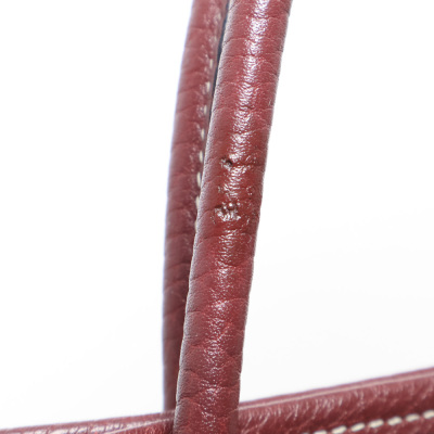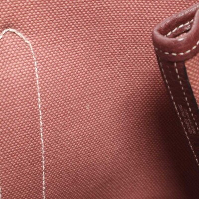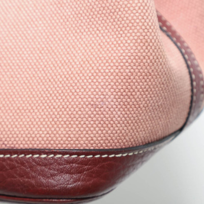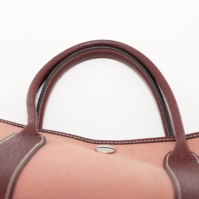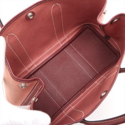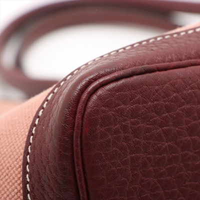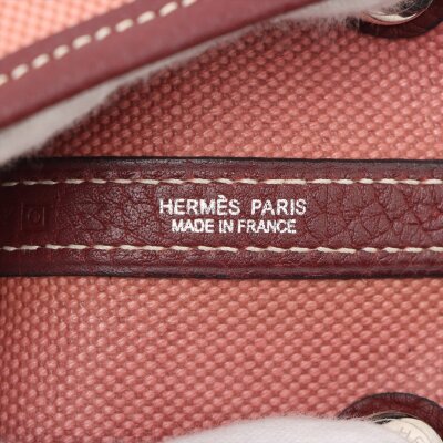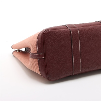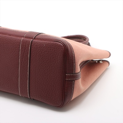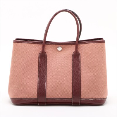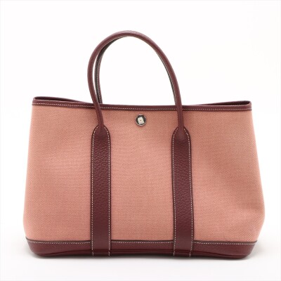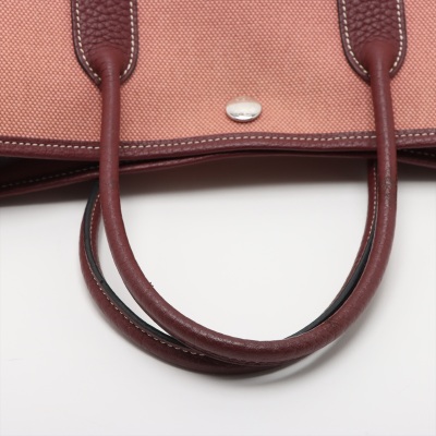 Hermes Garden Party 30 in dusty rose canvas and oxblood leather trim (square O: 2011). Featuring silver-toned hardware, dual rolled leather handles, and snap button closures on sides and front. This opens to a matching canvas interior with an oxblood leather base. Approximate dimensions: 30cm(W) x 20cm(H) x 13.5cm(D), with a 10cm handle drop. With Entrupy Certificate of Authenticity.