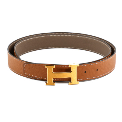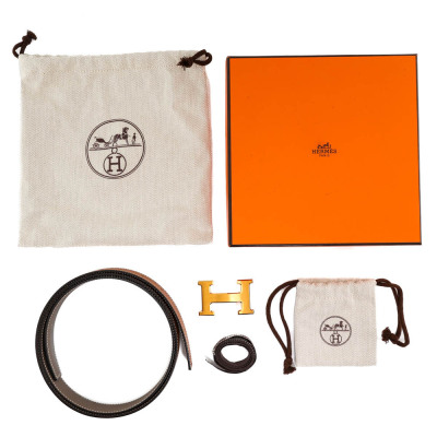 Hermes H Buckle 32mm Reversible Leather Belt. Length 105cm. Yellow gold plated steel. Material: Leather. Colour: Brown/Tan. Made in France. With Hermes Box, pouch for buckle & pouch for belt. (Pre-owned)*