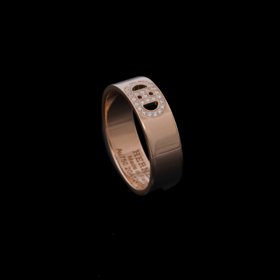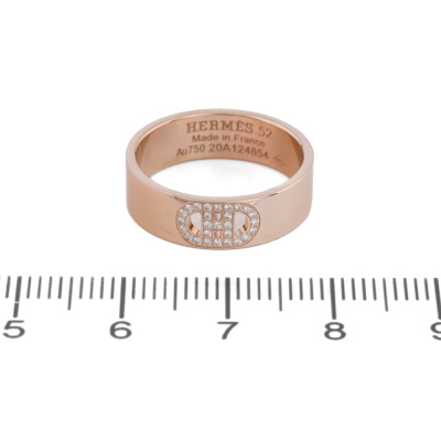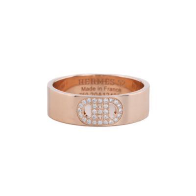 Hermes H d'Ancre ring, small model with 27 round Natural Diamonds totalling 0.07ct. 18ct rose gold. Hermes stamped size 52, measures as Australian size: L - ring resizing is not recommended. Band Width: 5.5mm. Made in France. Weight: 4.9g. (Pre-owned)
