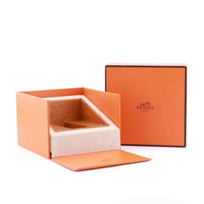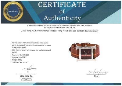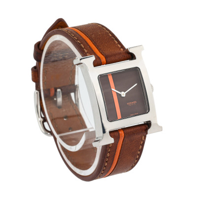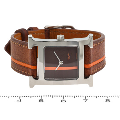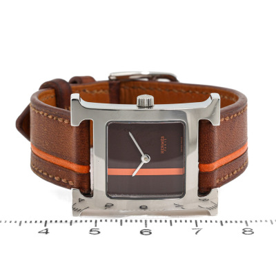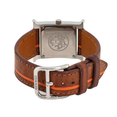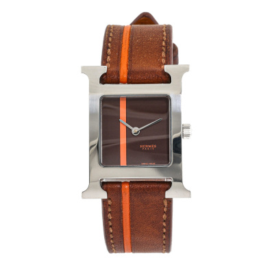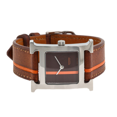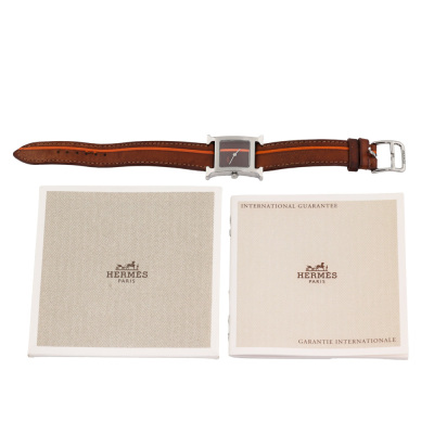 Hermes Heure H Small model stainless steel quartz ladies watch. Brown with orange dial, case diameter: 25mm x 21mm, strap length: 17cm, Swiss made. Ref# HH1.210. With Hermes brown with orange line leather strap and buckle. With Certificate of Authenticity, undated Hermes International Guarantee booklet and Hermes box. No warranty provided. (Pre-owned)