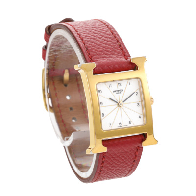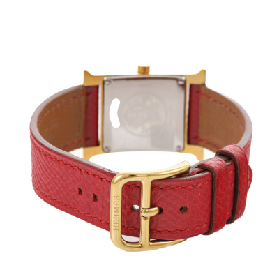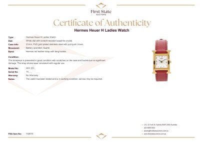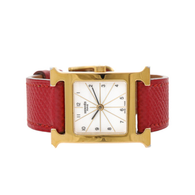 Hermes Heuer H stainless steel quartz ladies watch. White dial, case diameter: 21mm, max wrist size: 16.5cm, Swiss made. Ref# HH1.201. With Hermes red leather strap and buckle. With Certificate of Authenticity and Hermes box. No warranty applies.