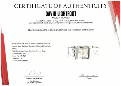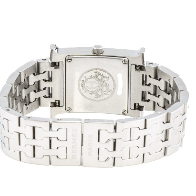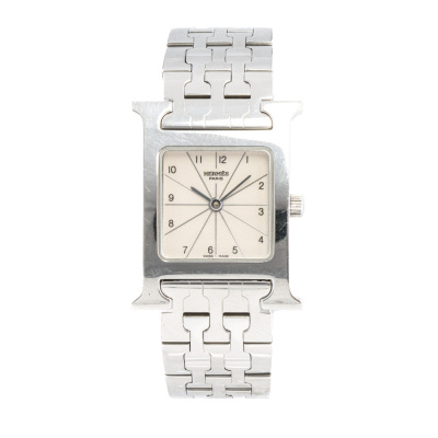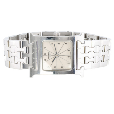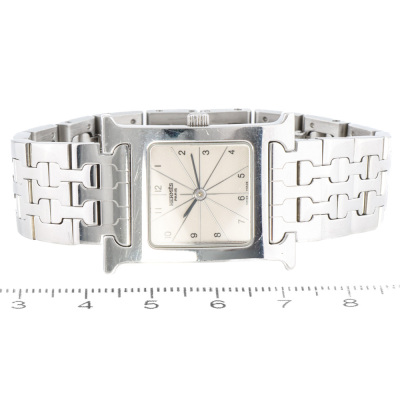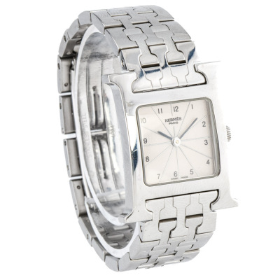 Hermes Heuer H Medium model stainless steel quartz watch. Silver dial, case diameter: 30mm x 26mm, wrist size: 15cm, Swiss made. Ref# HH1.210. With Hermes stainless steel bracelet and clasp. With Certificate of Authenticity. No warranty applies. Weight: 62.9g (Pre-owned)