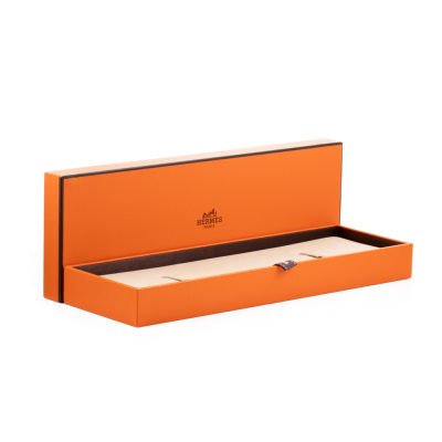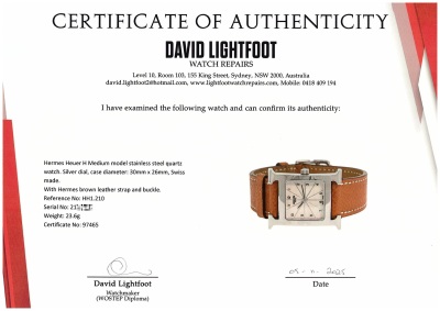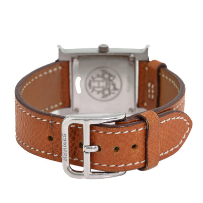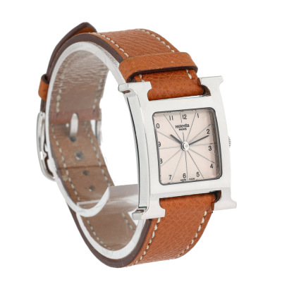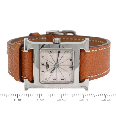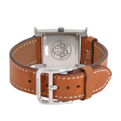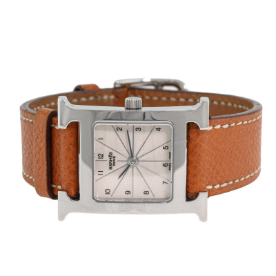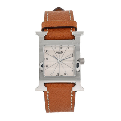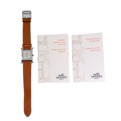 Hermes Heuer H Medium model stainless steel quartz watch. Silver dial, case diameter: 30mm x 26mm, max wrist size: 16cm, Swiss made. Ref# HH1.210. With Hermes brown leather strap and buckle. With Certificate of Authenticity, Hermes International Guarantee booklet dated 26/11/2006 and Hermes box. No warranty applies. Weight: 23.6g (Pre-owned)