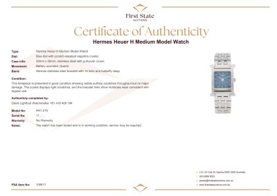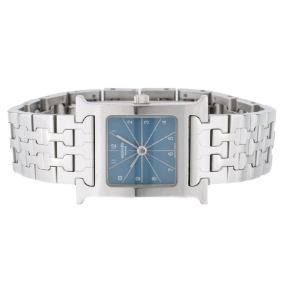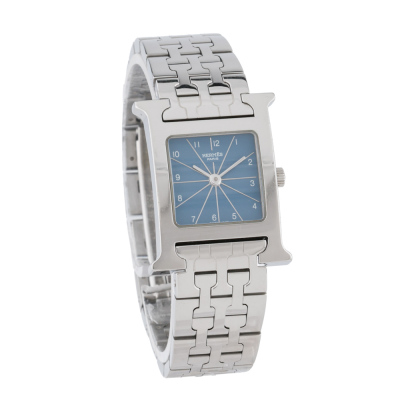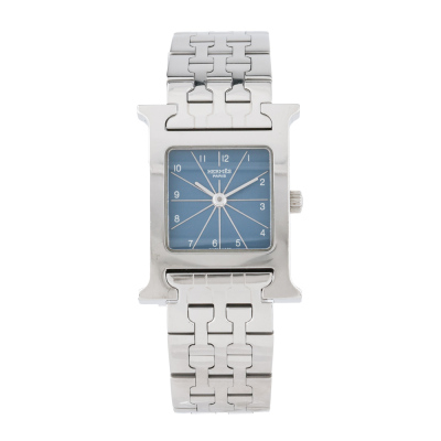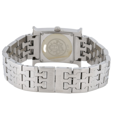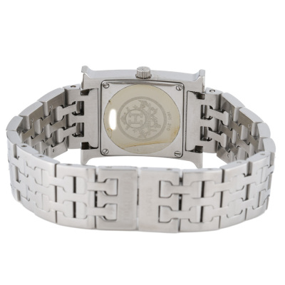 Hermes Heuer H Medium model stainless steel quartz watch. Silver dial, case diameter: 30mm x 26mm, max wrist size: 17cm, Swiss made. Ref# HH1.210. With Hermes stainless steel bracelet and clasp. With Certificate of Authenticity and Hermes box. No warranty applies. Weight: 67.7g