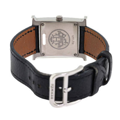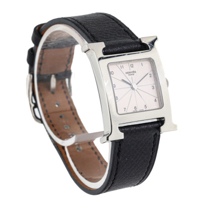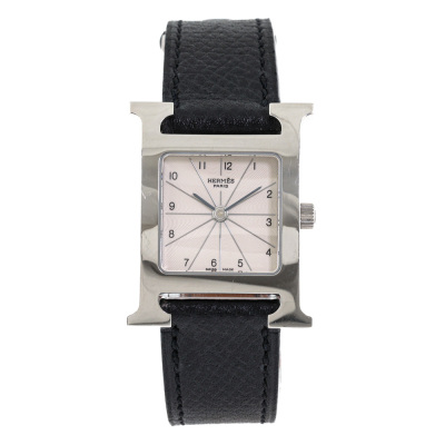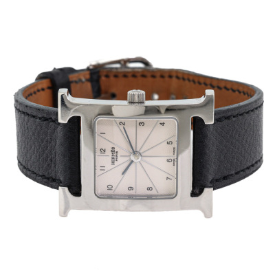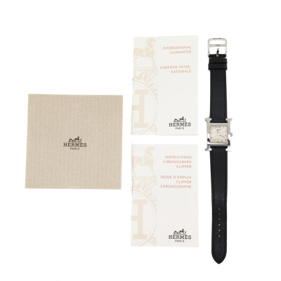 Hermes Heuer H Medium model stainless steel quartz watch. Silver dial, case diameter: 30mm x 26mm, max wrist size: 16cm, Swiss made. Ref# HH1.210. With Hermes black leather strap and buckle. With Certificate of Authenticity, undated Hermes International Guarantee booklet and Hermes box. No warranty applies