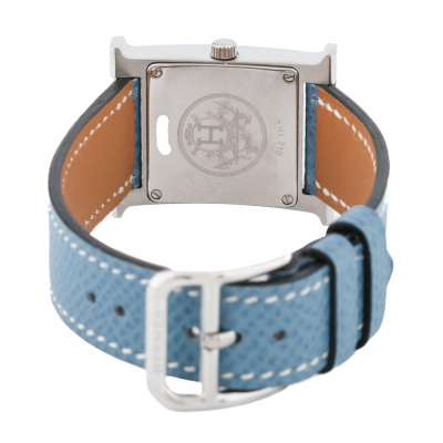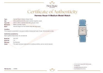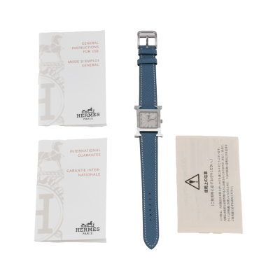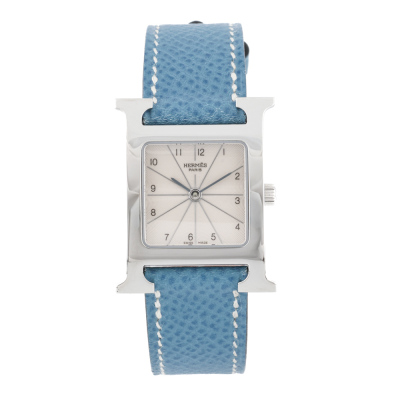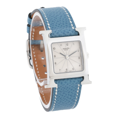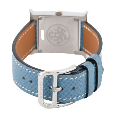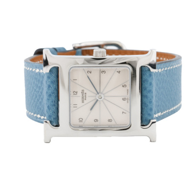 Hermes Heuer H Medium model stainless steel quartz watch. Silver dial, case diameter: 30mm x 26mm, max wrist size: 16cm, Swiss made. Ref# HH1.210. With Hermes blue leather strap and buckle. With Certificate of Authenticity, Hermes International Guarantee booklet dated 04/2004 and Hermes box. No warranty applies. Weight: 23.1g