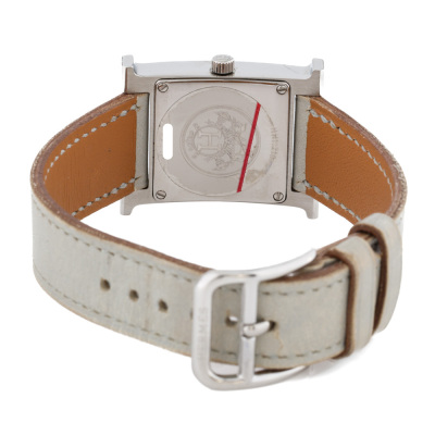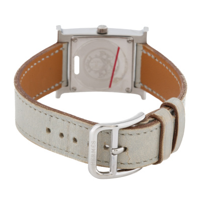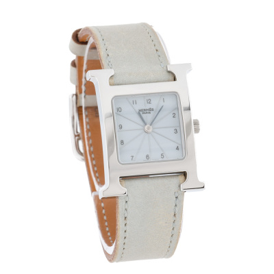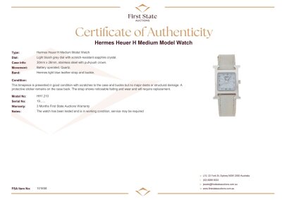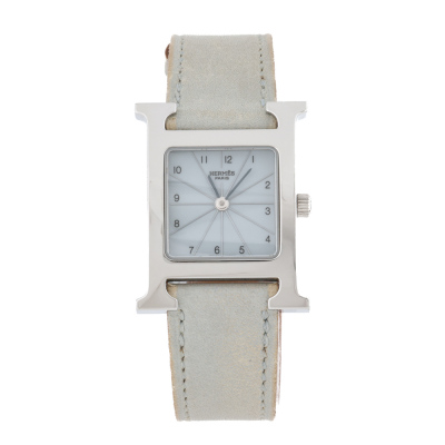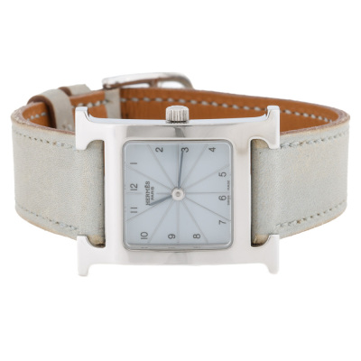 Hermes Heuer H Medium model stainless steel quartz watch. Light bluish grey dial, case diameter: 30mm x 26mm, max wrist size: 16cm, Swiss made. Ref# HH1.210. With Hermes light blue leather strap and buckle. With Certificate of Authenticity and Hermes box. No warranty applies