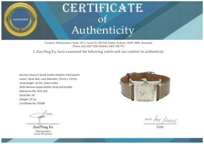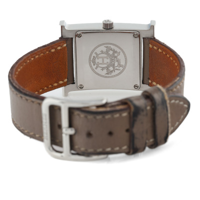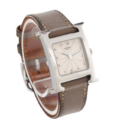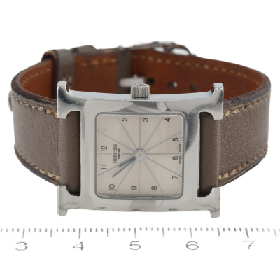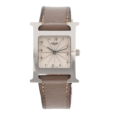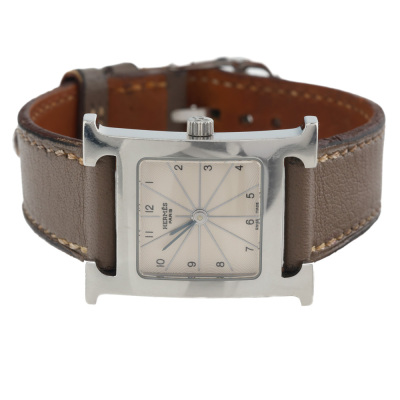 Hermes Heure H Small model stainless steel quartz ladies watch. Silver dial, case diameter: 25mm x 21mm, strap length: 16.5m, Swiss made. Ref #HH1.210. With Hermes taupe leather strap and buckle. With Certificate of Authenticity. No warranty provided. (Pre-owned)