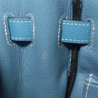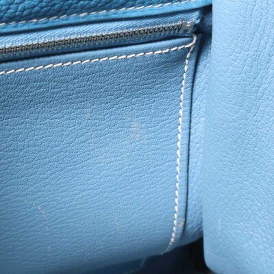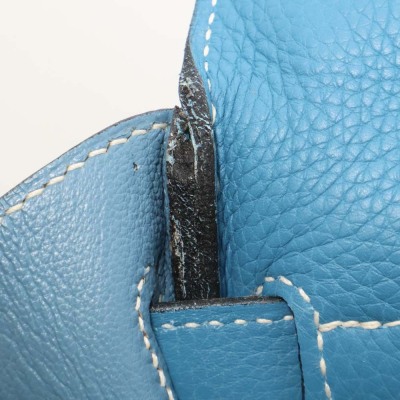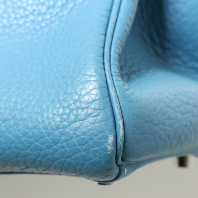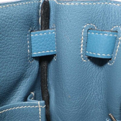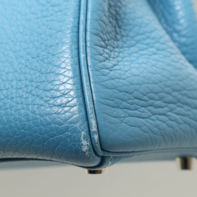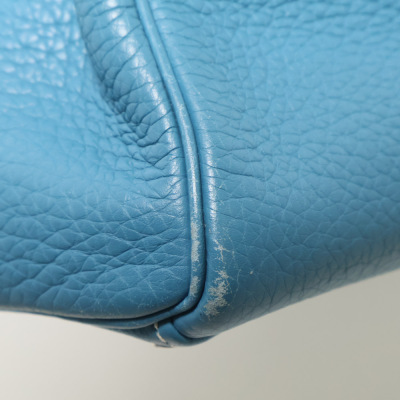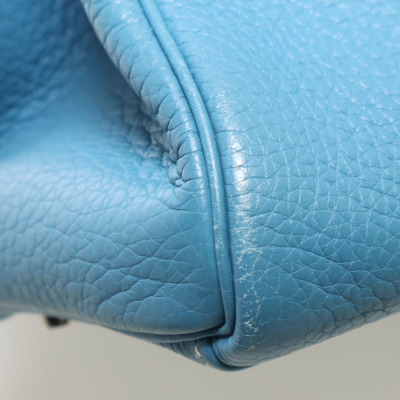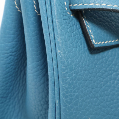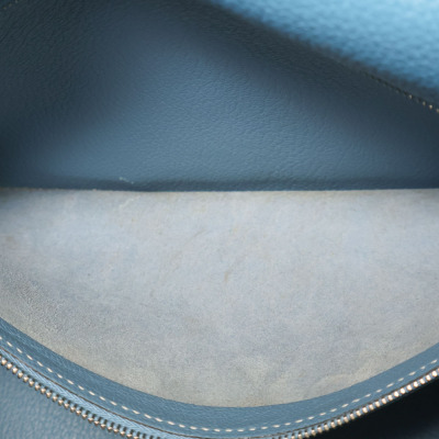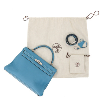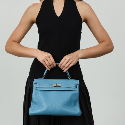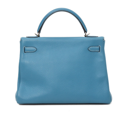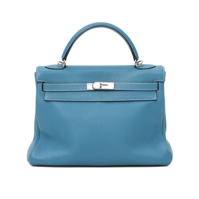 Hermes Kelly 32 bag in blue jean Taurillon Clemence leather (Square J | 2006). Featuring silver-toned hardware, leather top handle, a detachable leather strap, frontal flap with straps and a turn lock closure. The flap opens to a matching colour leather interior with zippered and flat pockets. Approximate dimensions: 32cm(Base-W) x 22.5cm(H) x 12.5cm(D), with a 9.5cm handle drop and 43.5cm strap drop. Accompanied by a Hermes clochette with keys, padlock, and dustbag. With Entrupy Certificate of Authenticity.