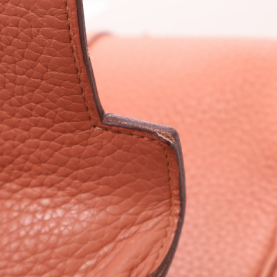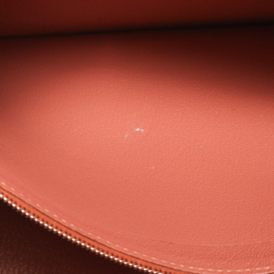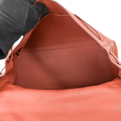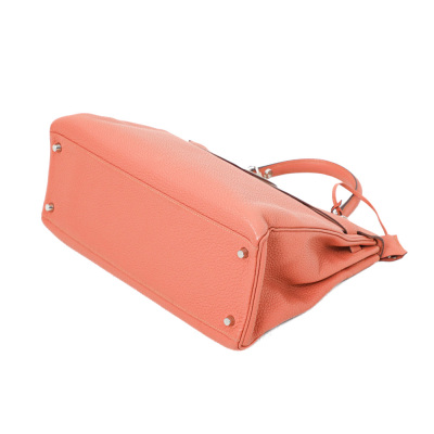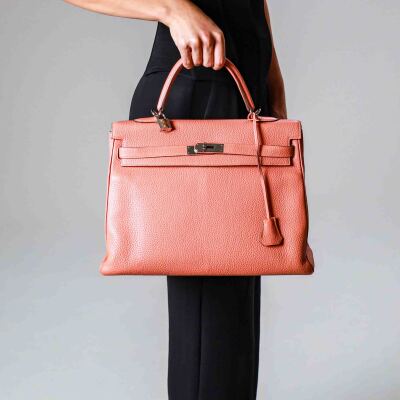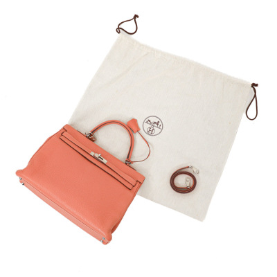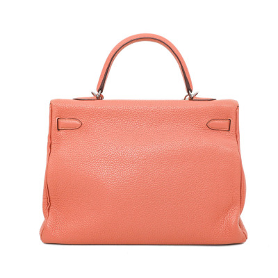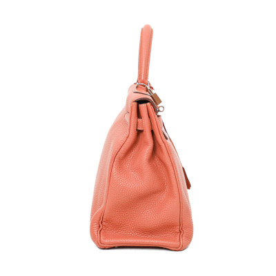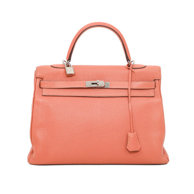 Hermes Kelly 35 in rose tea Taurillon Clemence leather (Square Q, circa 2013). Featuring silver-toned hardware, a single rolled top handle, a detachable strap and twist-lock closure. The front flap opens to a matching leather interior with a zippered pocket and two patch pockets. Approximate dimensions: 35cm(Base-W) x 24cm(H) x 13cm(D), with a 10cm handle drop and 44cm strap drop.