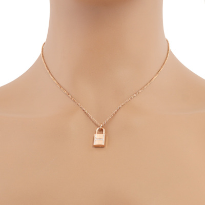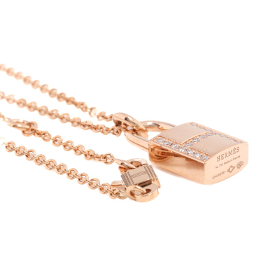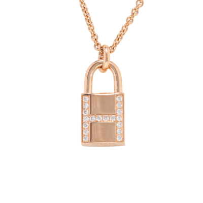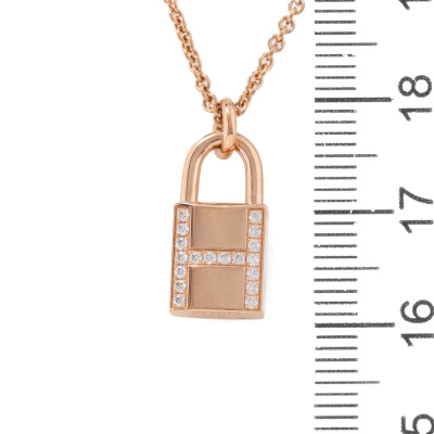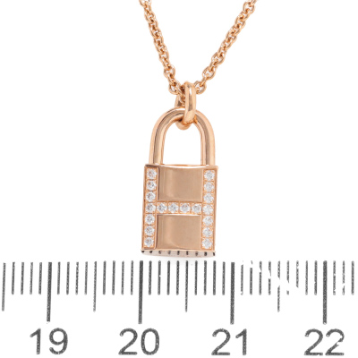 Hermes Kelly Cadenas pendant with 18 round Natural Diamonds totalling 0.09ct. Motif size: 15mm. 18ct rose gold with Hermes 18ct rose gold adjustable 40cm chain. Made in France. Weight: 8.7g. With Hermes box. With Hermes Certificate & purchase card dated: 15/02/2023 (Pre-owned)