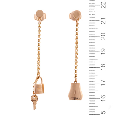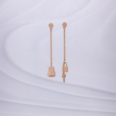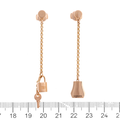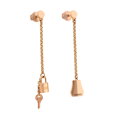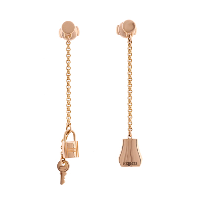 Hermes Kelly Clochette earrings. Earring Length: 5.8cm & 6.4cm. Bell motif size: 1.09cm x 0.73cm. Key motif size: 1.60 x 0.57cm. 18ct rose gold. Made in France. Weight: 9.1g. (Pre-owned)