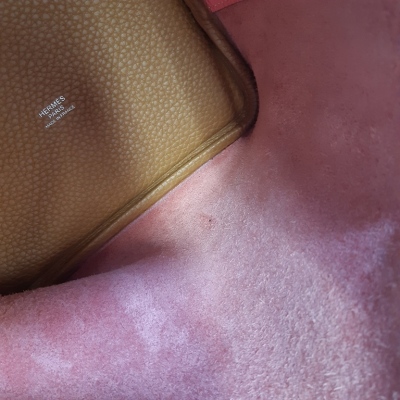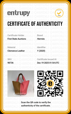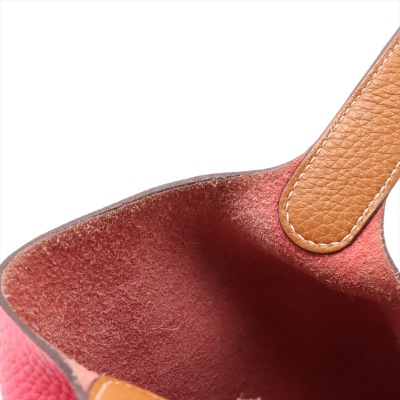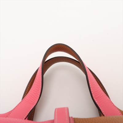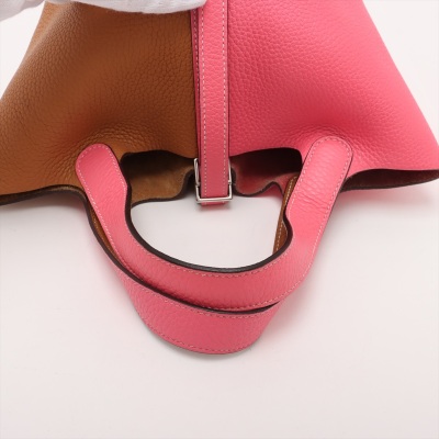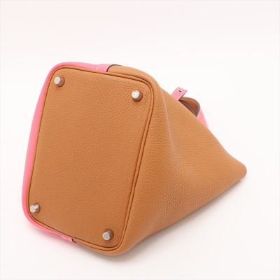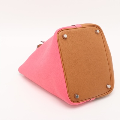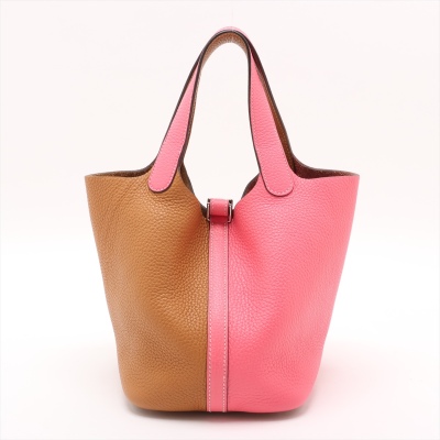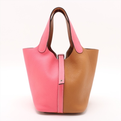 Hermes Picotin Lock 18 PM bag in two toned sesame and rose azalea Taurillon Clemence leather (Y: 2020). Featuring silver-toned hardware, leather top handles, and open top with hanging strap closure. This opens to a spacious brown suede interior. Approx dimensions: 18cm(L) x 18.5cm(H) 13cm(D), and 13cm handle drop. Accompanied by Hermes padlock, keys, and a small dustbag. With Entrupy Certificate of Authenticity. (Pre-owned)