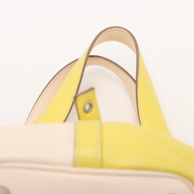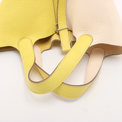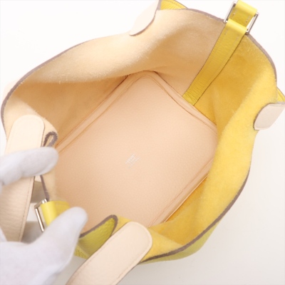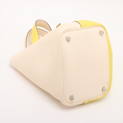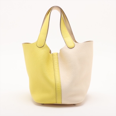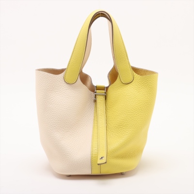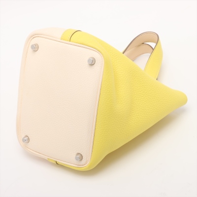 Hermes Picotin Lock PM in Jaune Milton & Nata bicolour Taurillon Clemence leather (Y: 2020). Featuring silver-toned hardware, leather top handles, and open top with hanging strap closure. This opens to a matching bi-coloured suede interior with leather base. Approximate dimensions: 18cm(W) x 18cm(H) x 14cm(D), with a 13cm handle drop. Accompanied by Hermes padlock and keys. With Entrupy Certificate of Authenticity.