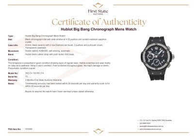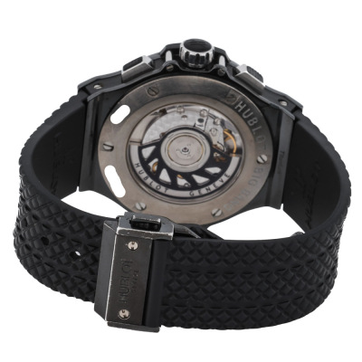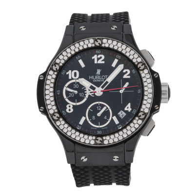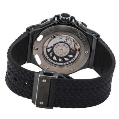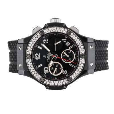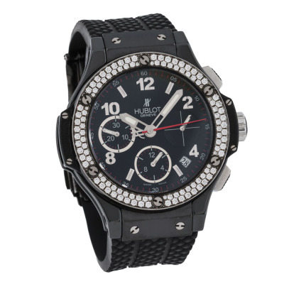 Hublot Big Bang black ceramic automatic mens watch. Black chronograph dial, date, case diameter: 41mm, adjustable max wrist size: 18.5cm, Swiss made. Ref# 342.CV.130.RX.114. With Hublot black rubber strap and clasp. With Certificate of Authenticity. 3 month FSA warranty.