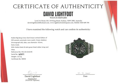 Hublot Big Bang Unico Dark Green Limited Edition of 250 ceramic automatic mens watch. Green skeleton chronograph dial, date, case diameter: 42mm, wrist size: 20cm, Swiss made. Ref# 441.GX.5210.RX. With Hublot black & dark green lined rubber strap and clasp. With Certificate of Authenticity, Hublot Certificate of Authenticity and Hublot box. 3 month FSA warranty. Weight: 115.2g