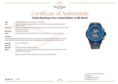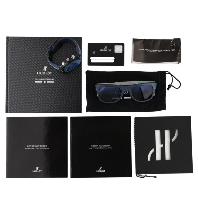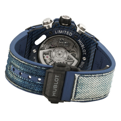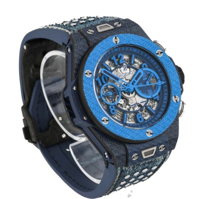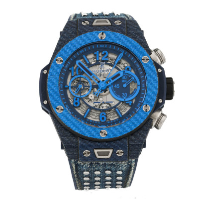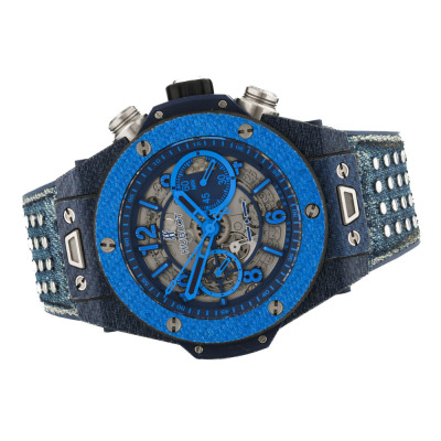 Hublot Big Bang Unico Italia Independent Blue Limited Edition of 500 carbon fibre automatic mens watch. Skeleton chronograph dial, date, case diameter: 45mm, adjustable max wrist size: 19cm, Swiss made. Ref# 411.YL.5190.NR.ITI15. With Hublot blue fabric strap with silver studs & blue rubber back and clasp. With Certificate of Authenticity, Hublot International Warranty card dated 11/06/2016 and Hublot box. 3 month FSA warranty